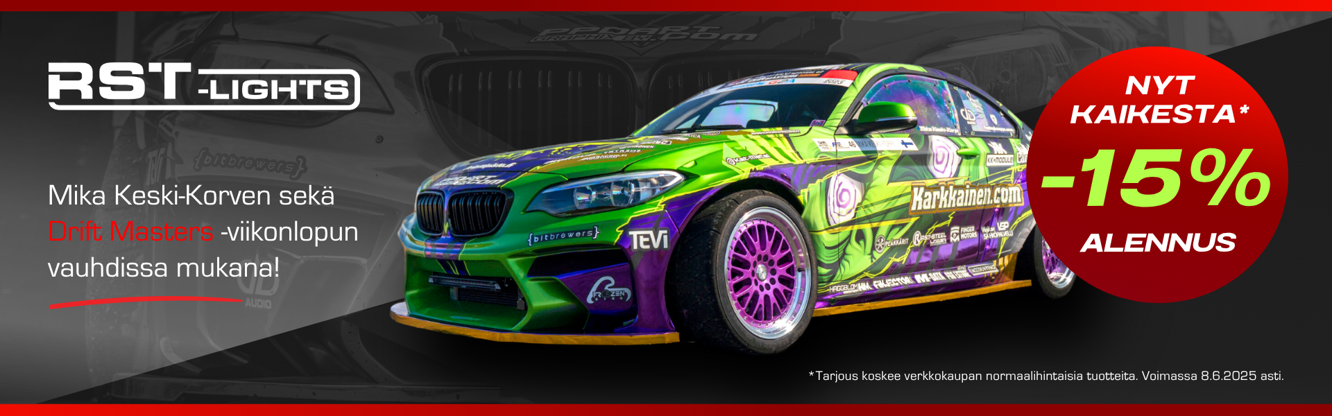 Tänä viikonloppuna ajetaan Drift Masters GP Suomessa – ja sen kunniaksi tarjoamme -15 % alennuksen kaikista normaalihintaisista tuotteista verkkokaupassamme!