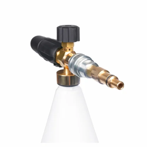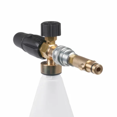 - HUOM! Uusiin, vuonna 2021 tai myöhemmin valmistettuihin Kränzlen painepesureihin menee Ergo-pikaliitinadapterilla oleva vaahdotin. Pikaliitinadapterin kanssa kannattaa vamistaa, että liitin lukittuu kunnolla, ettei suihkuputki tai vaahdotin lennä auton kylkeen.